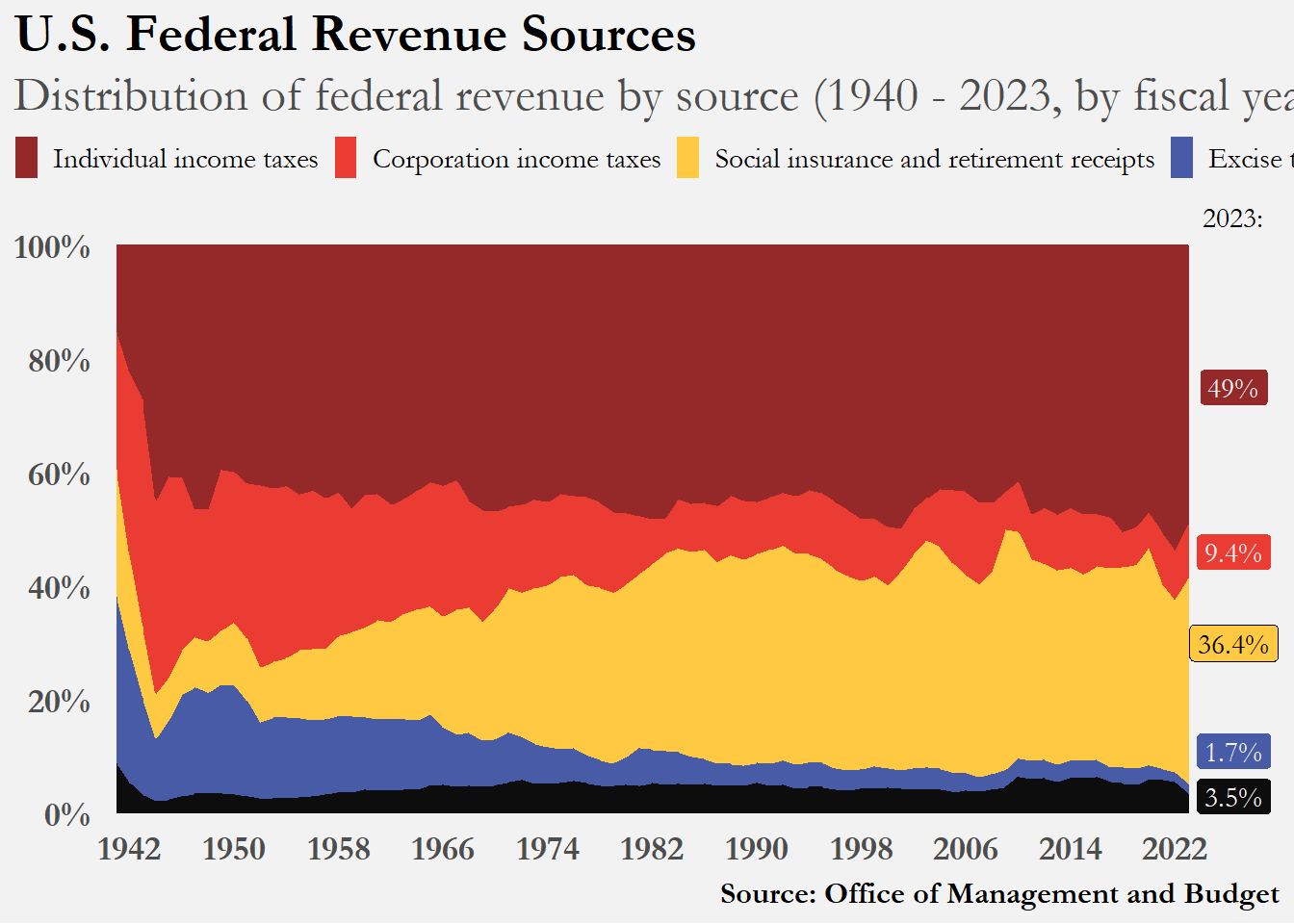 subtitle = "Distribution of federal revenue by source (1940 - 2023, by fiscal year)",